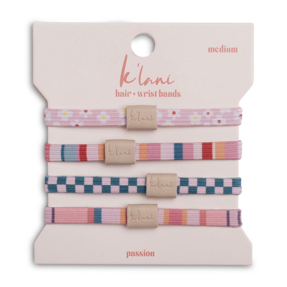 Our passion set includes four hair + wristbands that hold all hair types with ease. Each band has a cute pattern: checkers, flowers, and stripes in a bright and trendy color palette that will inspire the wearer to live passionately.
