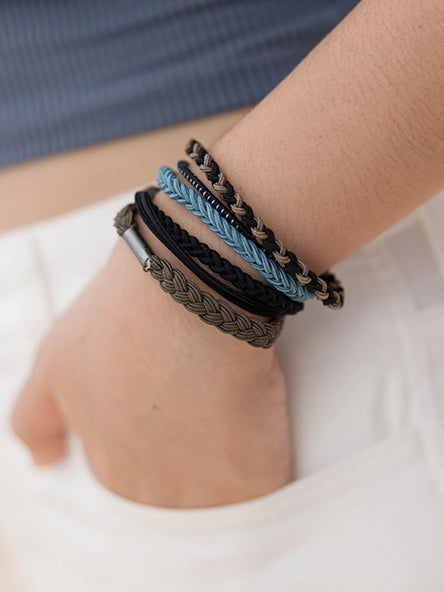Our HUSTLE set includes five hair tie bracelets in strong colors of black, brown, and blue with matte black details. This set is perfect for guys and girls and will make all who wear it bring a little more hustle to their game.