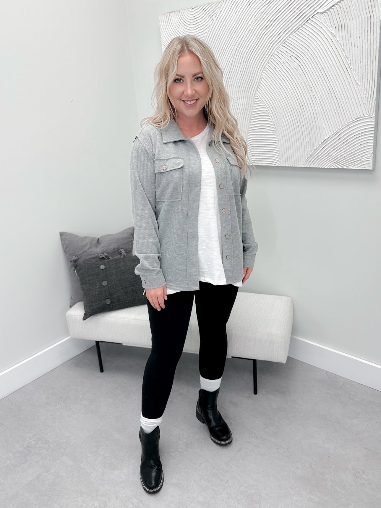 Waffle Knit Button Top in Grey