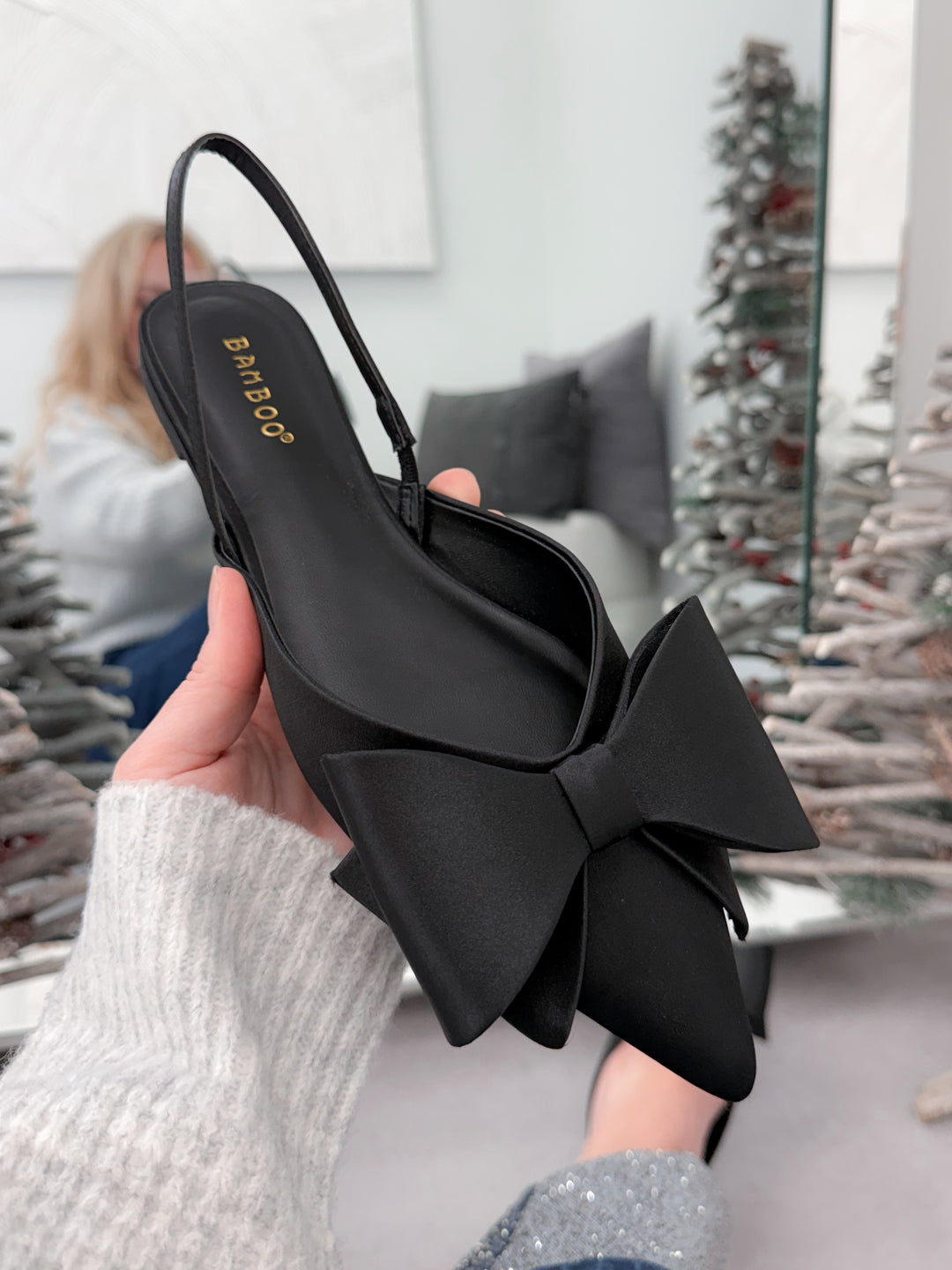 Blissful Bow Flat in Black Satin
